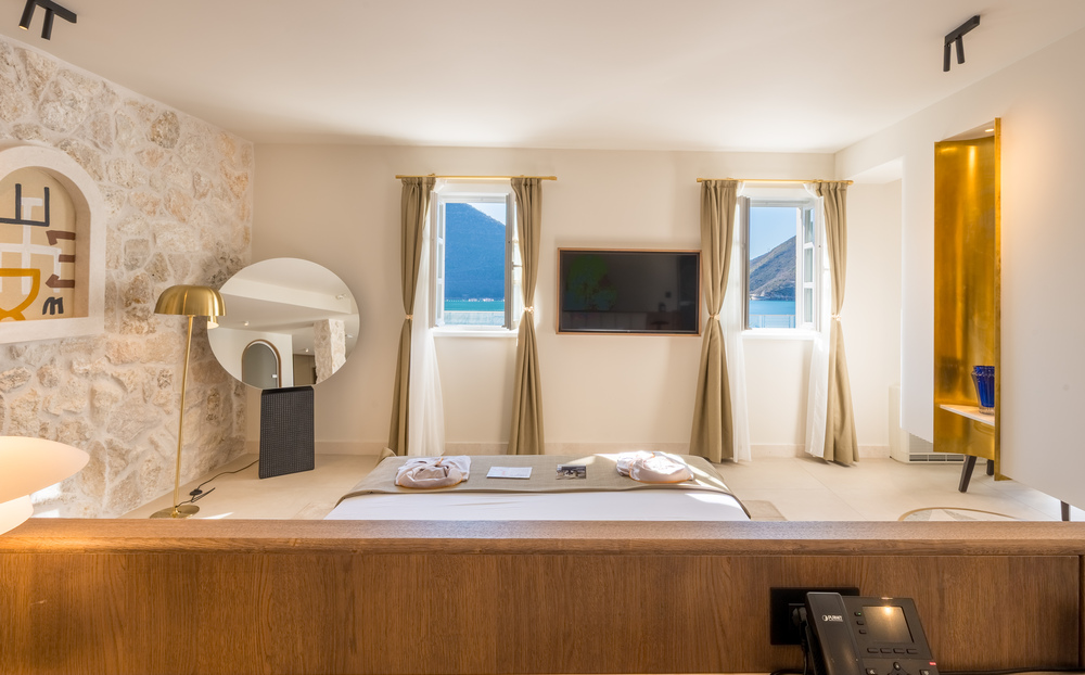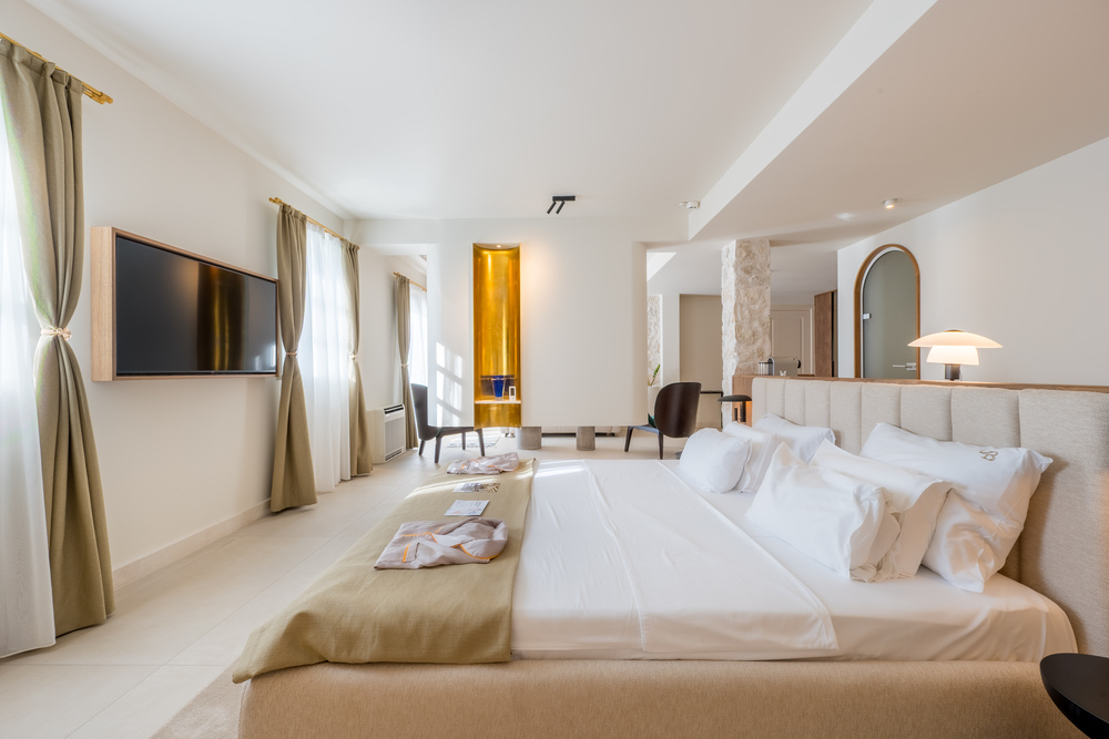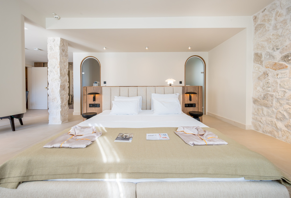 Santa bears the name of the hotel deservedly. It is our pride, made for “our soul”. Located on the first floor, Apartment Santa gazes out toward the bay, offering a front-row seat to the poetic stillness of the sea. With its private terrace and soothing palette, it captures the essence of quiet luxury — a space where time slows down, and every morning begins with light dancing on water.