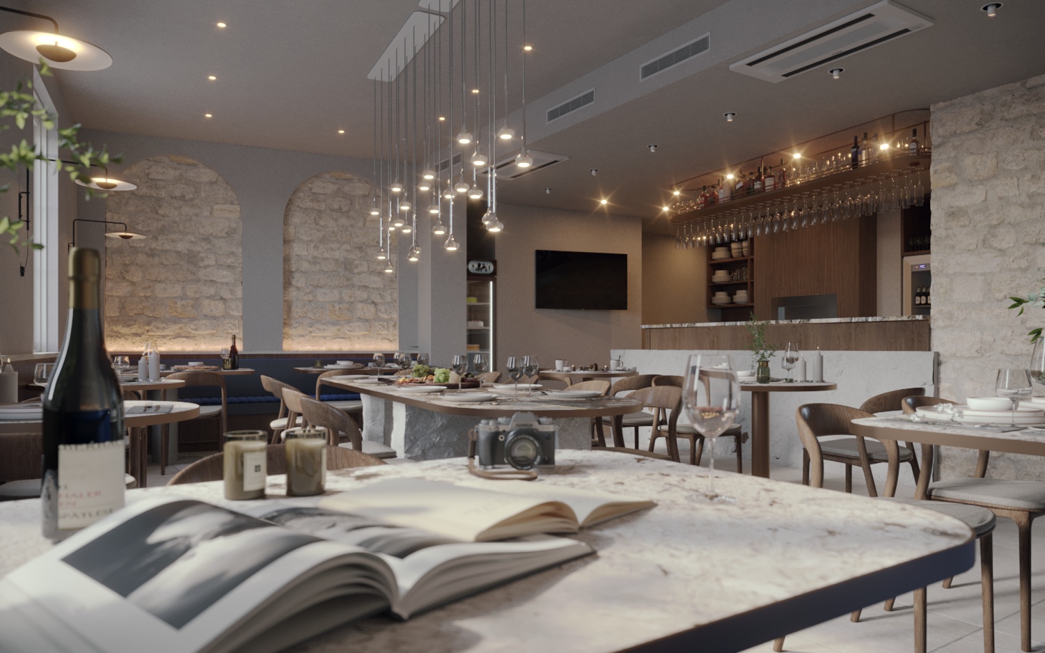 The kitchen is seamlessly connected to the restaurant via a staircase and a food elevator, ensuring efficient service. On the main floor, the restaurant accommodates 32 seats, while an additional 54 seats are avail- able on the roof terrace on the attic floor, providing stunning views.